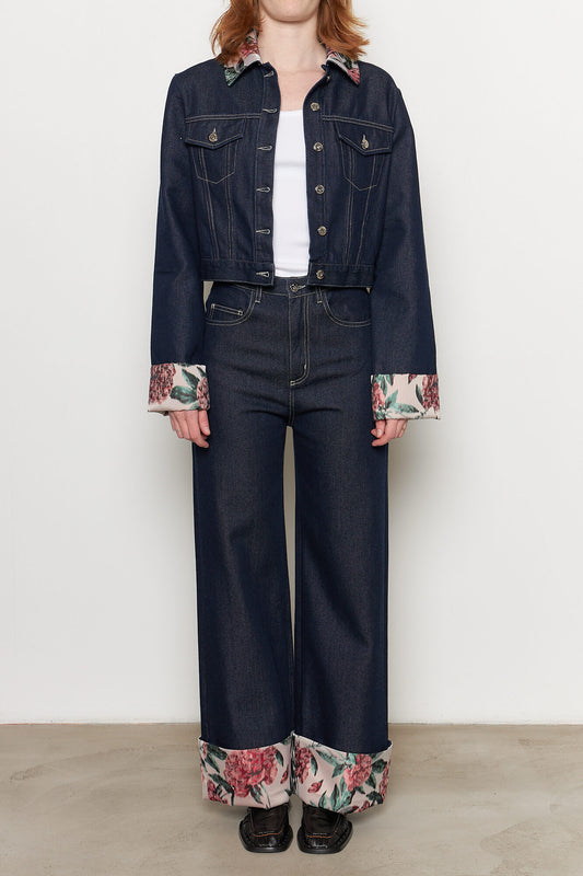 Indigo Denim Jeans with Brocade Turn Up