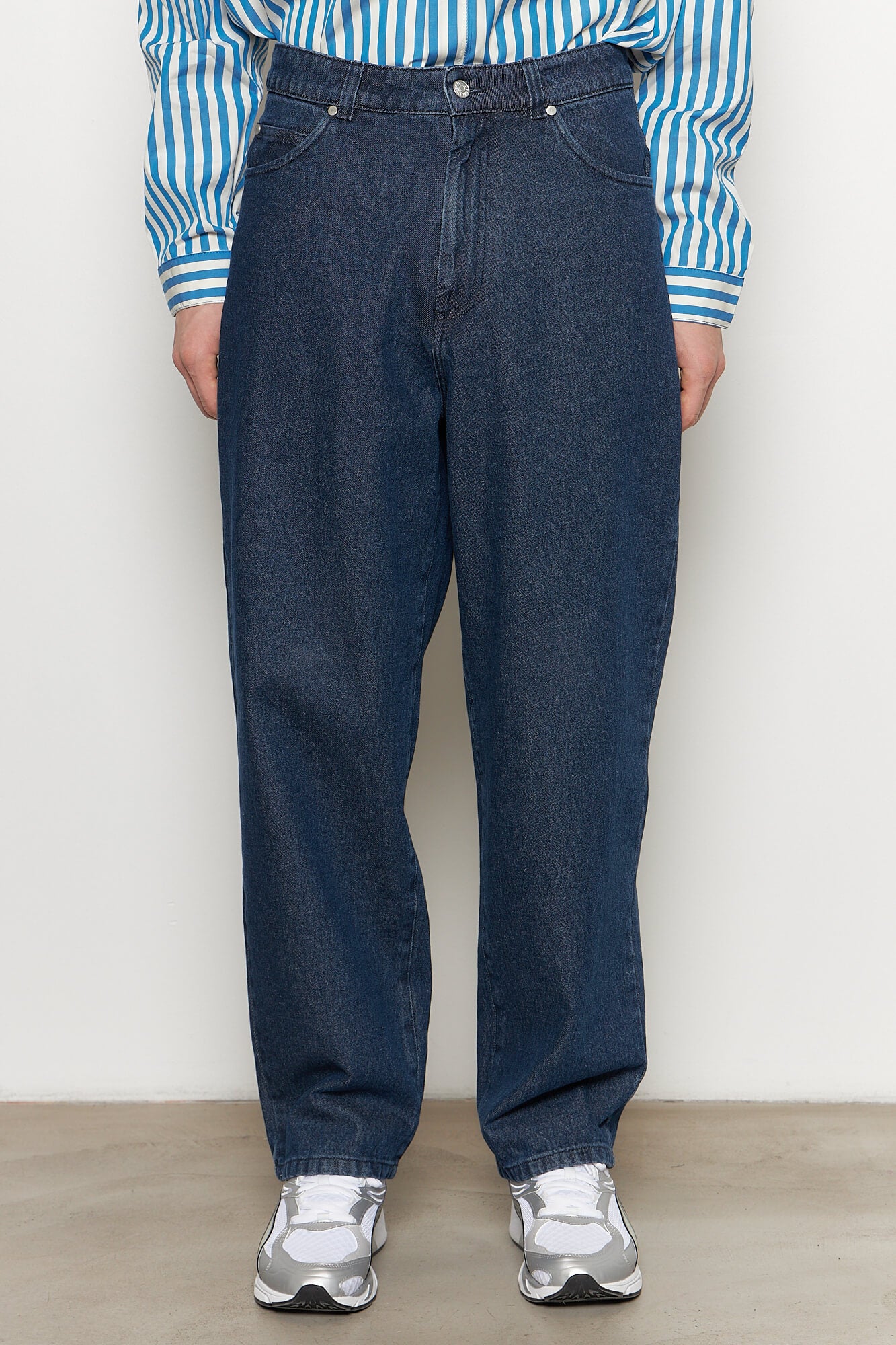 KIT loose-fitting jeans in rinse-wash indigo blue, crafted from 12.75 oz midweight denim. Finished with tonal twin-needle stitching and classic five-pocket construction.